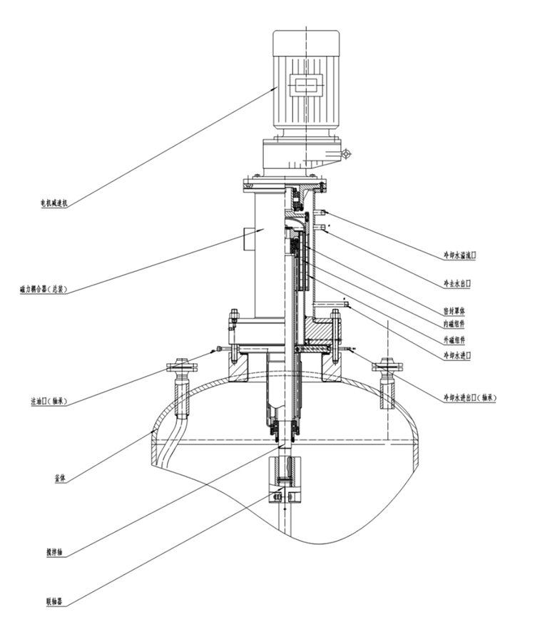 用稀土永磁制作的強(qiáng)磁回轉(zhuǎn)式耦合結(jié)構(gòu)(磁力驅(qū)動裝置),磁力驅(qū)動裝置的基本制造材料均為鐵磁性物質(zhì),磁導(dǎo)率極佳,磁場在穿過用于密封合金層時幾乎沒有損耗。由此外部驅(qū)動永磁體產(chǎn)生的旋轉(zhuǎn)磁場可以有效被內(nèi)部永磁體轉(zhuǎn)子接受,進(jìn)而帶動反應(yīng)器內(nèi)的攪拌部件進(jìn)行物料混合,攪拌速度為0~300r/min,甚至更高,可配推進(jìn)、槳式、錨式、框式、螺帶等各種槳。